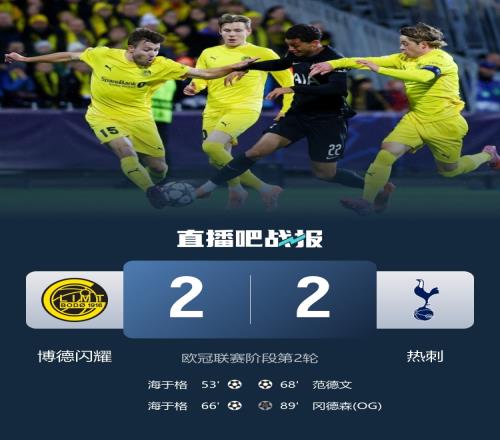 欧冠-热刺2-2绝平博德闪耀 海于格个人秀双响范德文破门