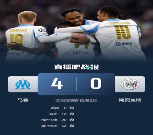 派尚2射1传,格林伍德破门,奥巴梅杨2传1射,最终马赛4-0阿贾克斯取得首胜。