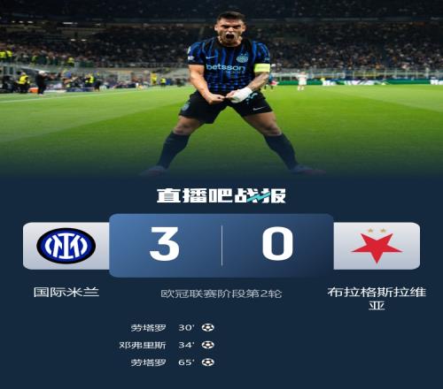国米3-0布拉格斯拉维亚欧冠两连胜 劳塔罗双响邓弗里斯建功